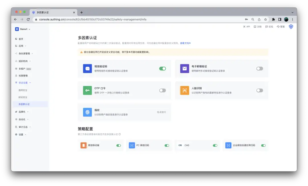 1.一键配置多因素认证(包含短信验证、邮箱验证、OTP 口令、人脸识别等):
