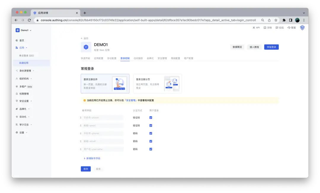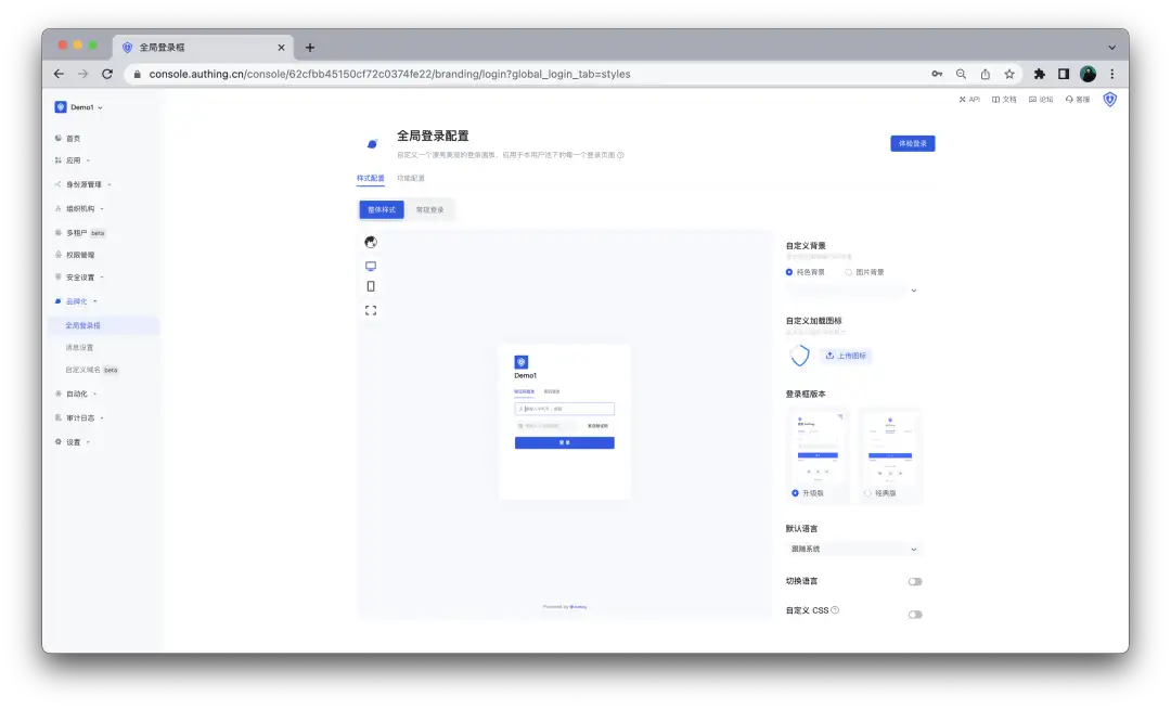 例如,当其中一个第三方登录方式只有极少用户使用,你需要及时更换一个更精确的第三方登录方式,或者增加一个新的第三方登录按钮。或者为了配合市场活动,需要更换登录页面 UI。使用 Authing,以上所有功能都只需要一键配置,例如: